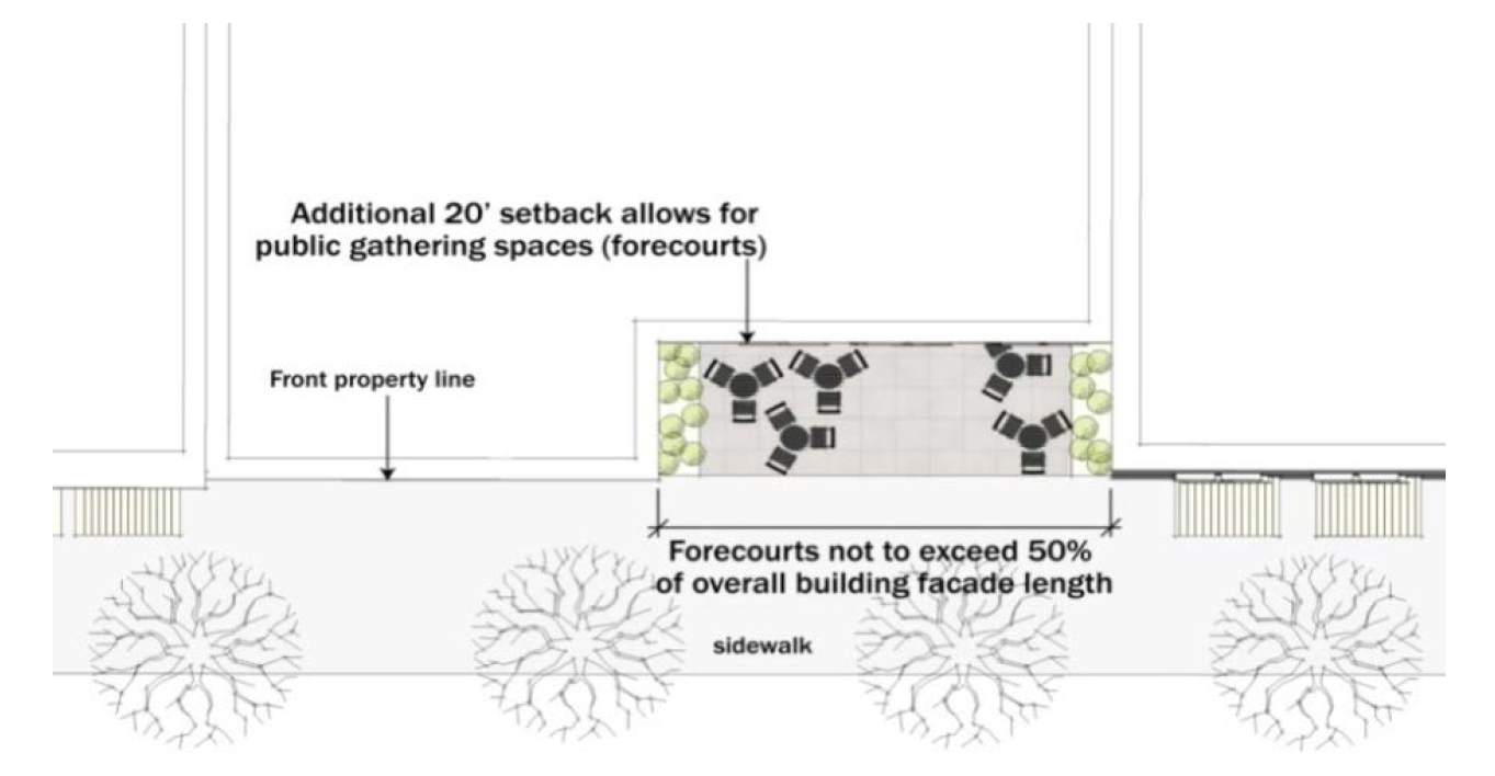 Along Front Street, or at identified "Gateway" corners, buildings may be set back up to 50 feet, provided the area within the setback is developed as a public plaza. In other locations, buildings may be setback up to 20 feet for not more than 50 percent of the length of the building facade, provided the area within the setback is developed as public or private gathering space, such as forecourts or plazas (see Figure 531-12).