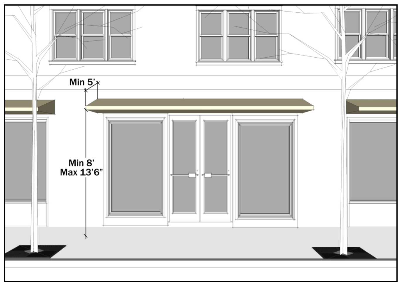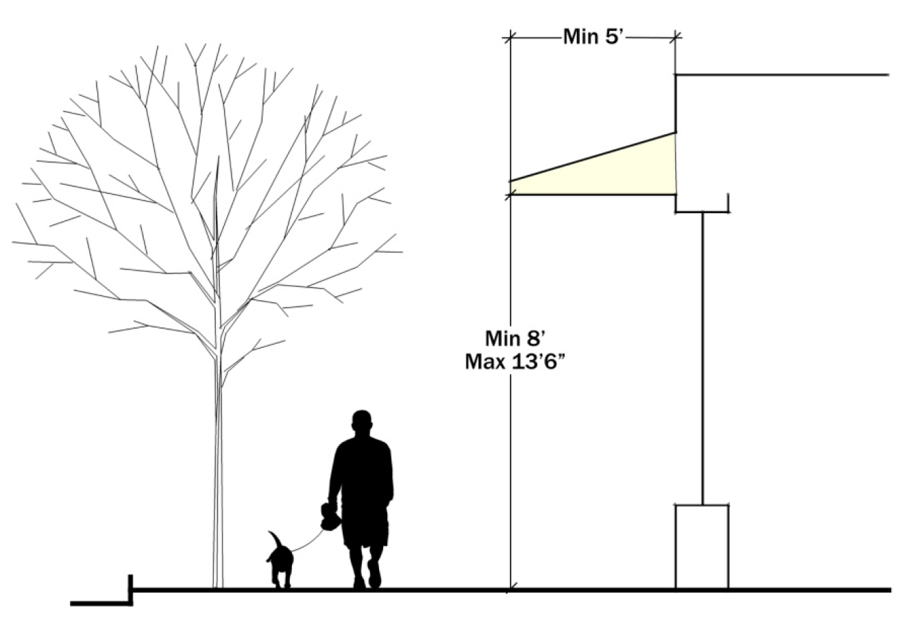 Include weather protection, in the form of awnings or canopies. Awnings and canopies shall have a minimum depth of five feet, and shall have a minimum clearance height above the sidewalk of eight feet and a maximum clearance height above the sidewalk of 13 feet six inches (see Figure 531-6); or