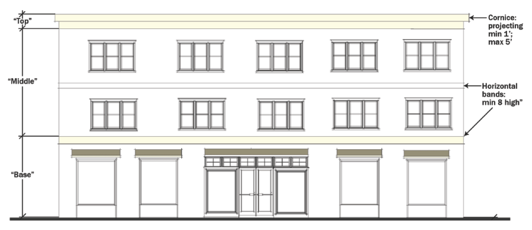 Horizontal bands, such as string courses or projecting cornices. Horizontal bands shall be a minimum of eight inches in height and must project a minimum of three-fourth inch from the building facade. Cornices must project a minimum of one foot, but not more than five feet, from the facade of the building.