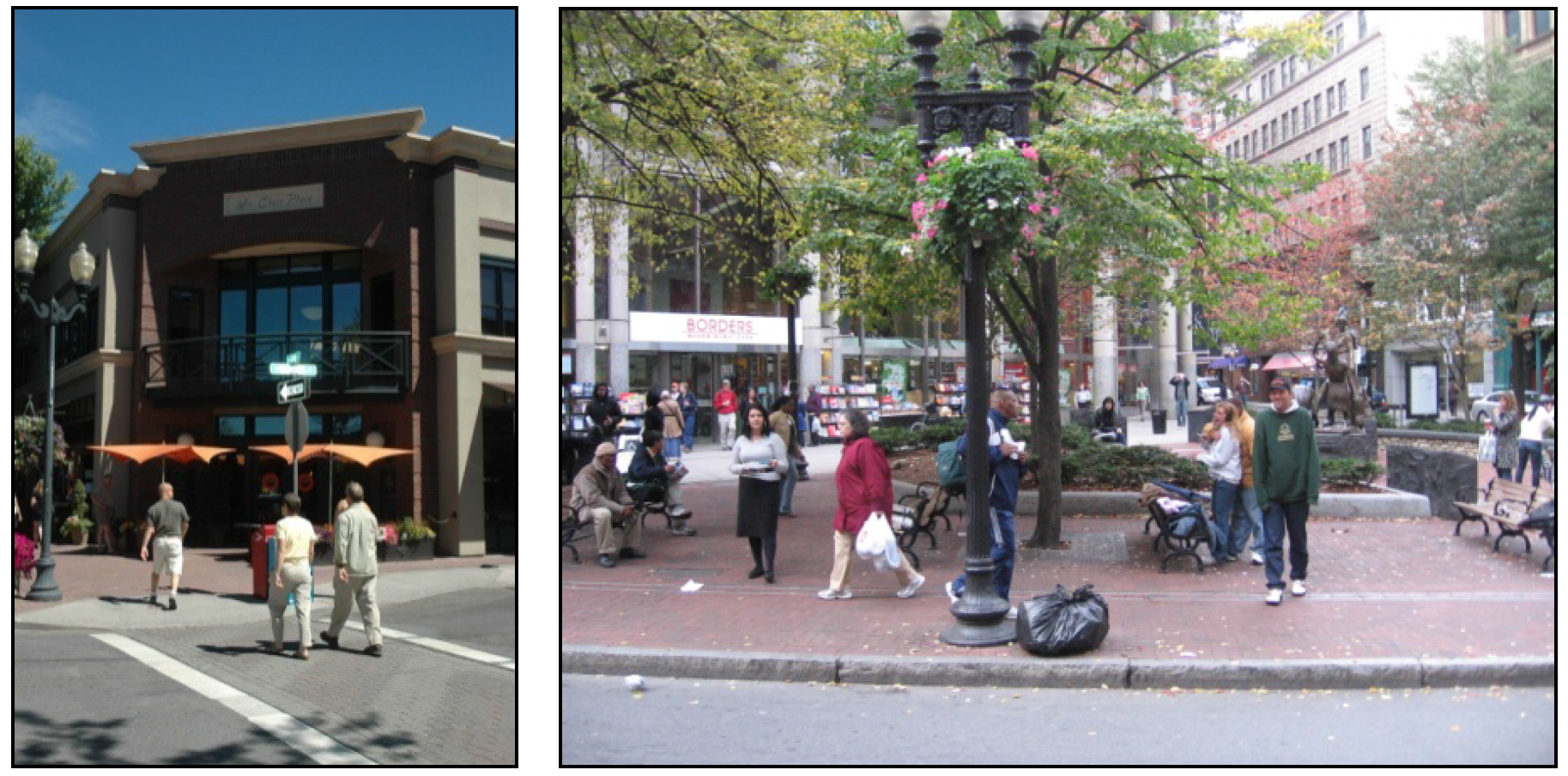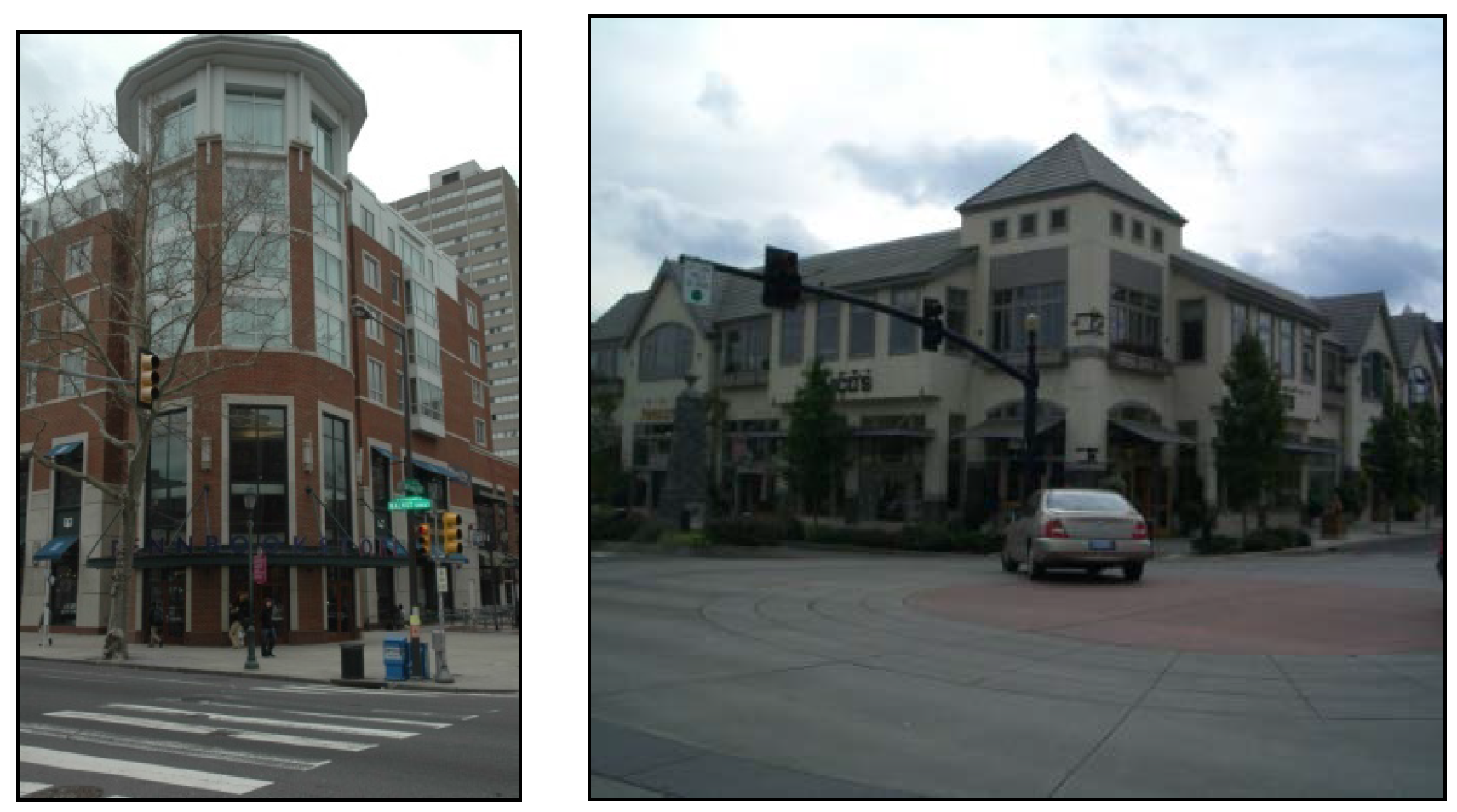 Public gathering spaces, such as plazas, located at the corner that incorporate visually distinct paving materials, site furnishings, and/or landscaping treatments (see Figure 531-20).