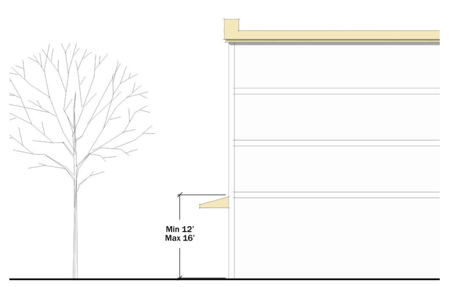 The ground floors of buildings along streets, or facing open space, shall be a minimum of 12 feet, but not more than 16 feet, in height (see Figure 531-3). For the purposes of this standard, ground floor height is measured from the top of the building foundation to the ceiling of the first floor.