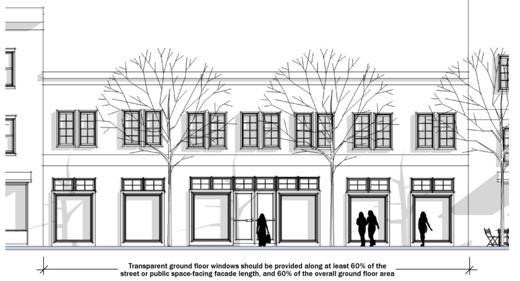 Ground floor building facades facing streets and open space shall include transparent windows along a minimum of 60 percent of the length, and on a minimum of 60 percent of the overall area, of the ground floor facade (see Figure 531-4). This includes ground floor facades facing streets, Pringle Creek, public open spaces, and private open spaces such as forecourts or plazas. For purposes of this standard, ground floor facade area includes exterior wall areas up to 12 feet above finished grade. Loading and service areas, ground floor parking, one-half story below grade visible parking, above grade raised foundations, and ground floor residential dwelling units are exempt from this requirement.