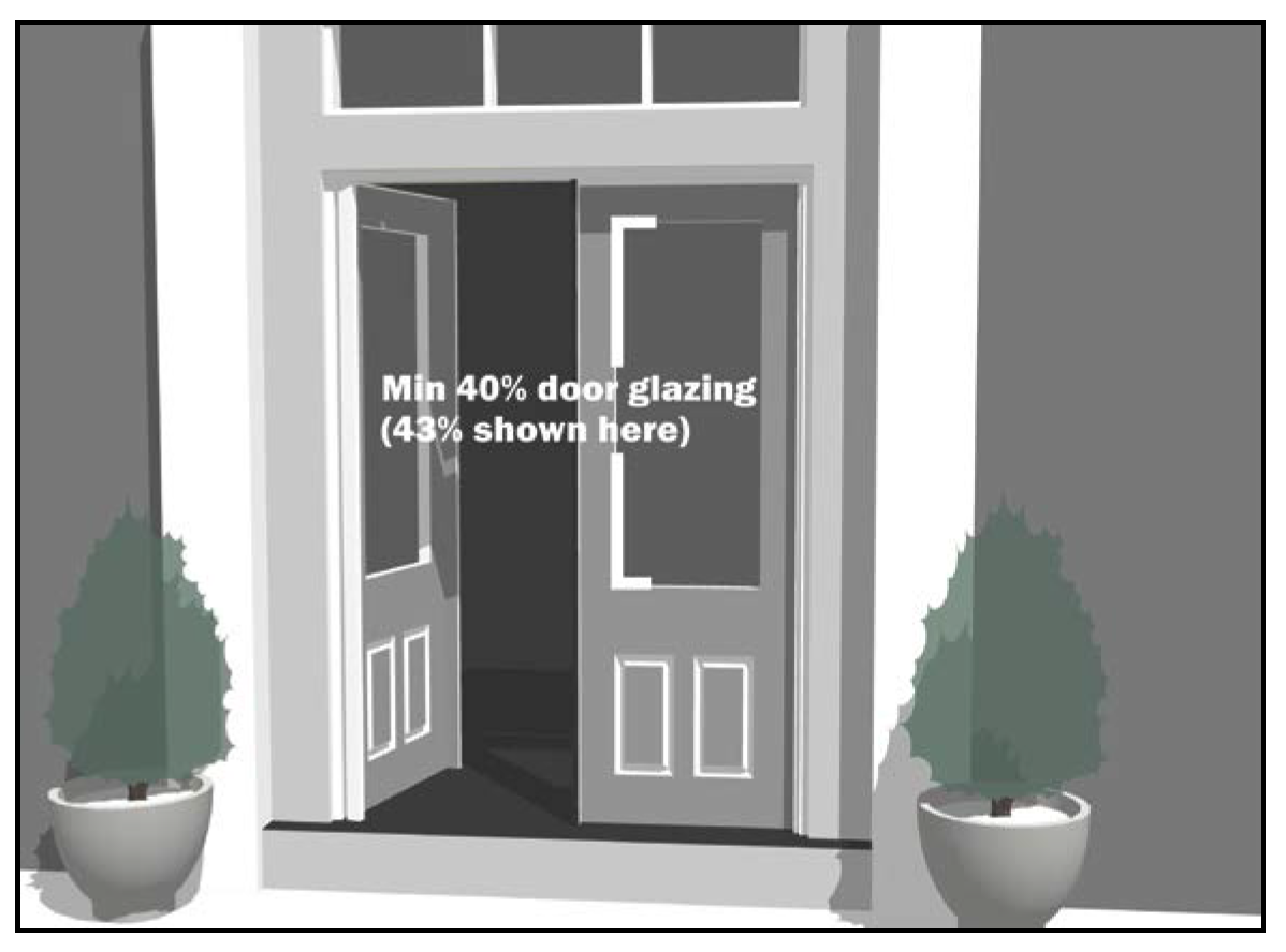 Primary building entries shall be comprised of a minimum of 40 percent transparent glass (see Figure 531-5). The glass shall have a minimum visible transmittance (VT) of 60 percent. Opaque doors are not permitted. Entries opening directly into individual residential dwellings are exempt from this requirement.
