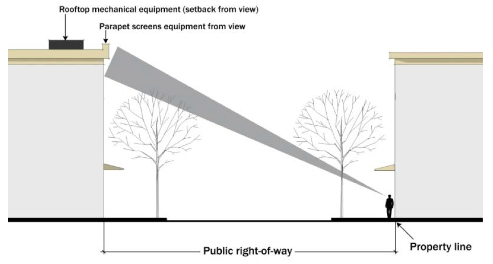 Rooftop mechanical equipment, with the exception of solar panels and wind generators, shall be setback and screened so as to not be visible to a person standing on the property line on the far side of any adjacent, at-grade public street (see Figure 531-9). All rooftop mechanical equipment shall be setback and screened so as to not be visible to a person standing 60 feet from the building within any adjacent public open space.