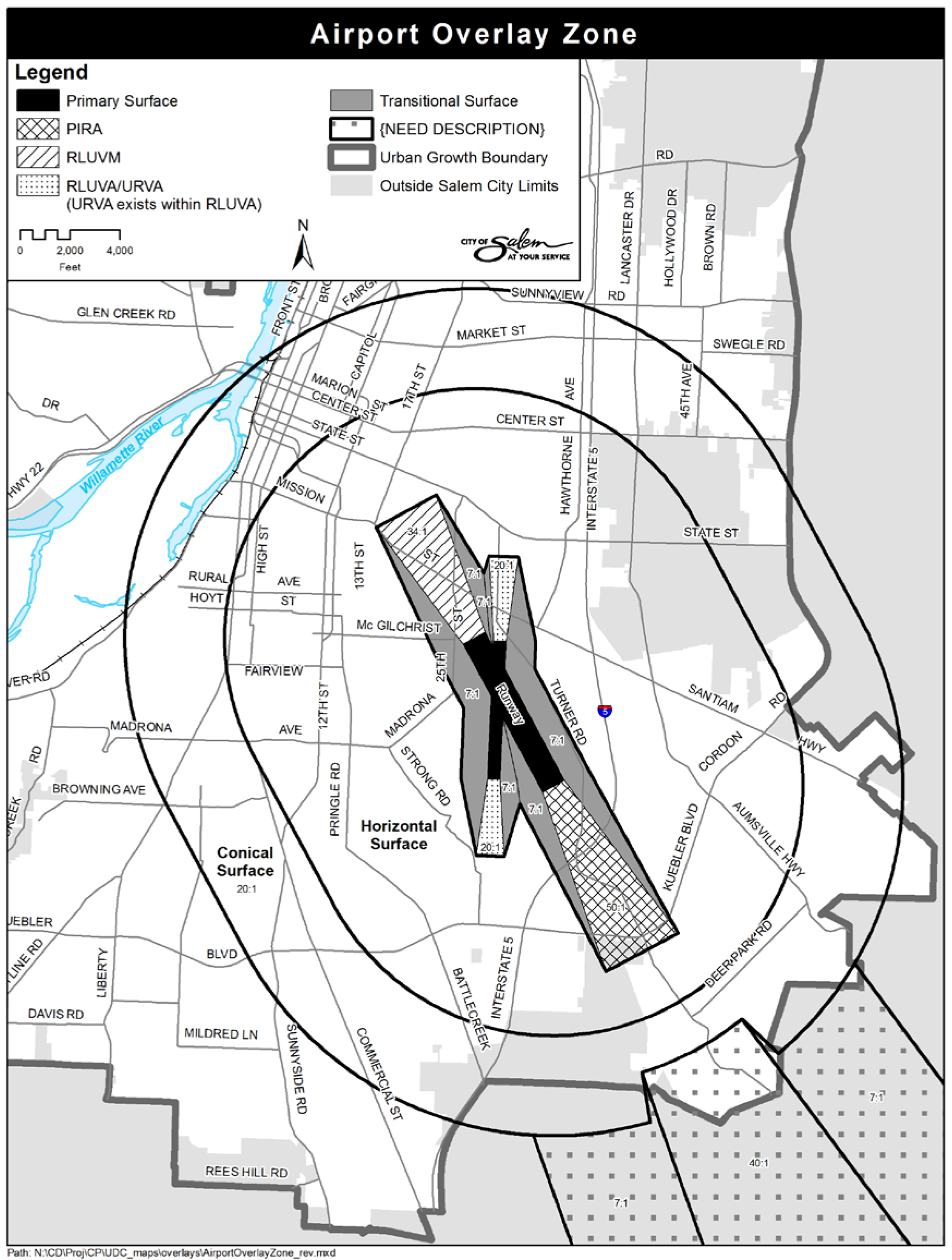 The boundaries of the Airport Overlay Zone are shown in Figure 602-1. The Airport Overlay Zone is divided into the following areas that apply to land beneath, upon, and above the approach surface, transitional surfaces, horizontal surface, and conical surfaces of McNary Field: