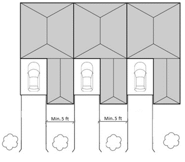Each individual garage and off-street parking spce is separated from any other garage and outdoor off-street parking space by a minimum of five feet; and