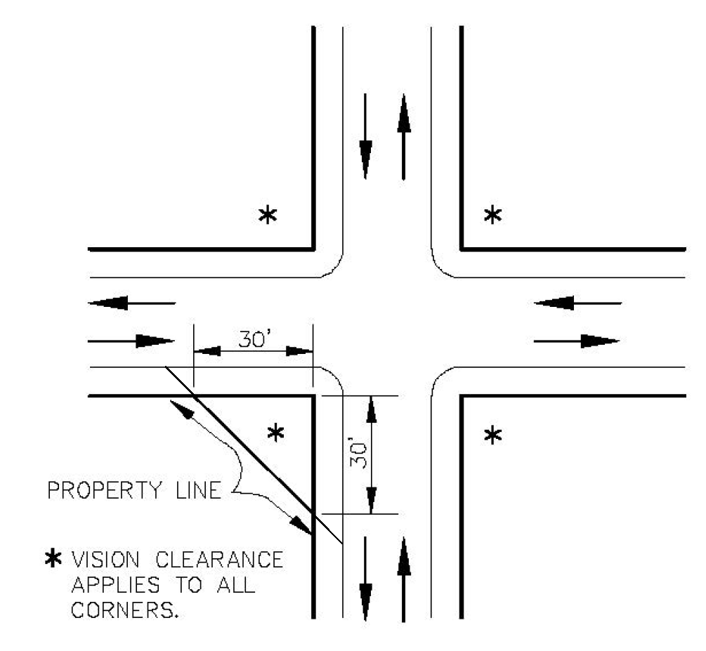 Uncontrolled intersections. At uncontrolled intersections, the vision clearance area shall have 30-foot legs along each street (see Figure 805-1).