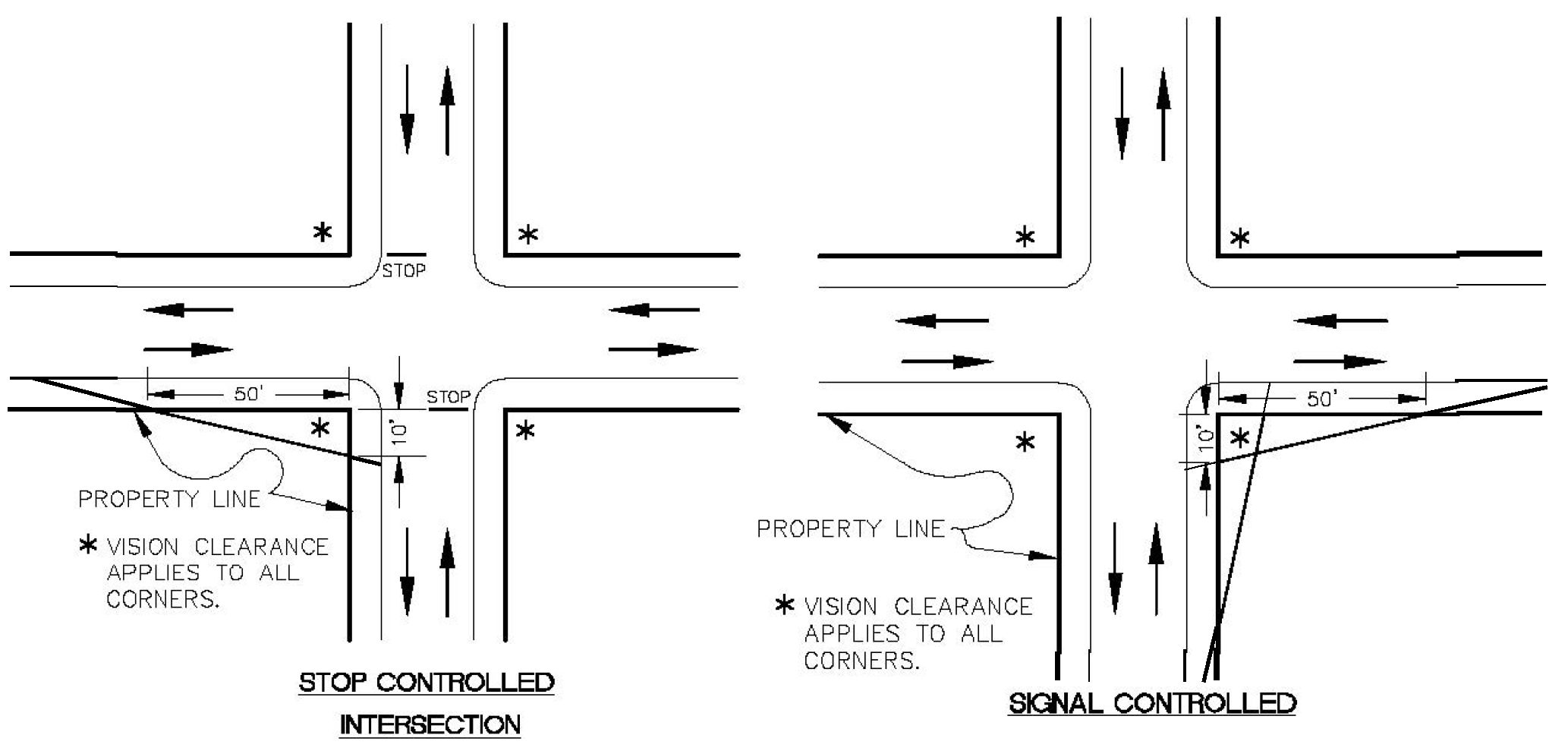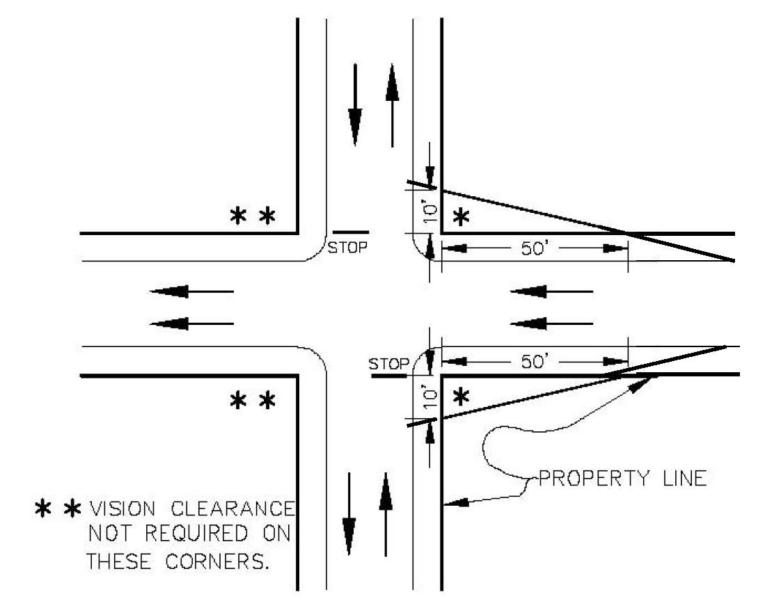 Controlled intersections. At controlled intersections, the vision clearance area shall have a ten-foot leg along the controlled street and a 50-foot leg along the uncontrolled street (see Figure 805-2).