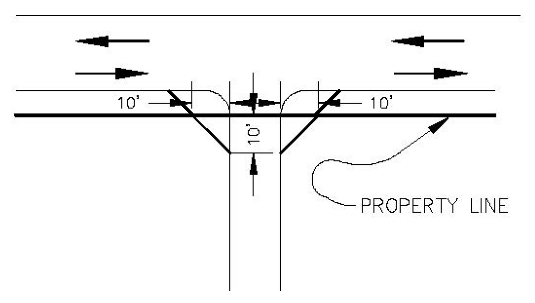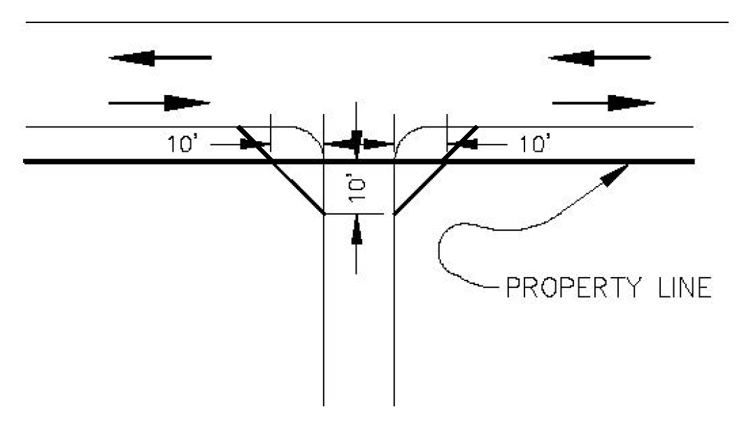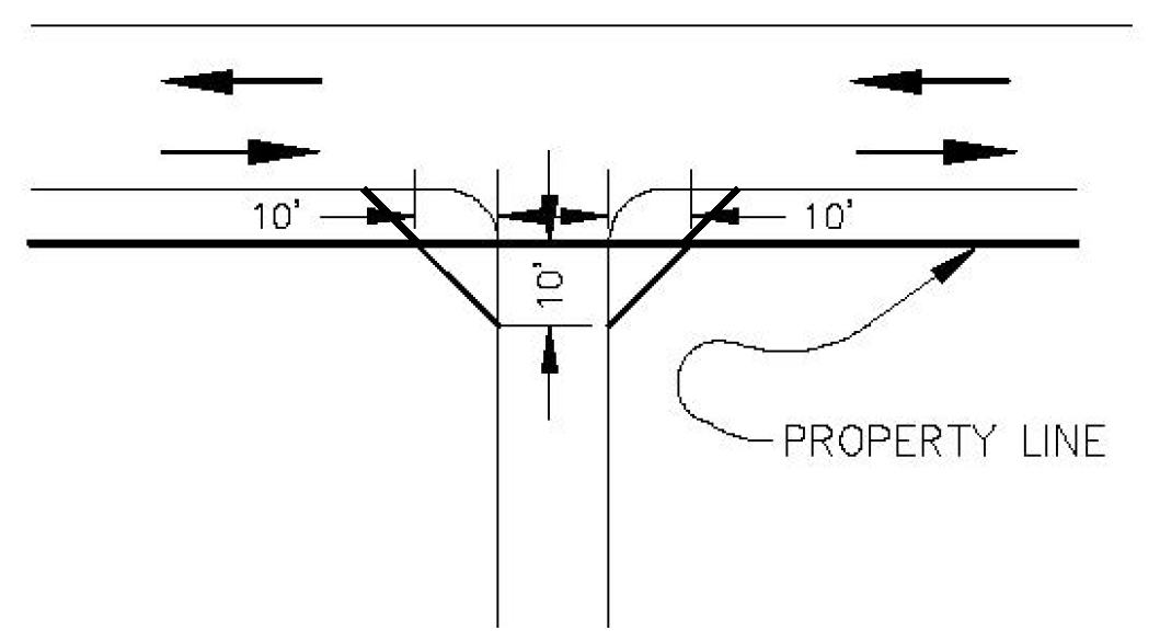Driveways serving uses other than single family and two family. Driveways serving uses other than single family and two family shall have a vision clearance area on each side of the driveway. The vision clearance area shall have ten-foot legs along the driveway and 50-foot legs along the intersecting street or alley (see Figure 805-5).