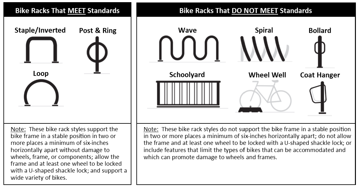 Examples of types of bicycle racks that do, and do not, meet these standards are shown in Figure 806-11.