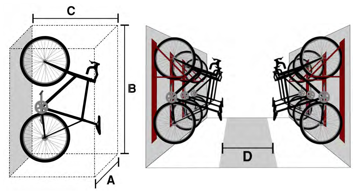 Bicycle racks. Where bicycle parking is provided in racks, the racks may be horizontal or vertical racks mounted to the ground, floor, or wall. Bicycle racks shall meet the following standards: