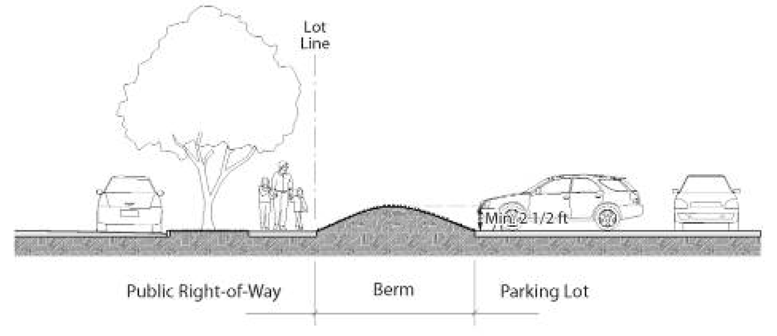Method B. The off-street parking and vehicle use area shall be setback to accommodate a berm, the top of which shall be a minimum of 2.5 feet higher than the elevation of the abutting off-street parking or vehicle use area (see Figure 806-2). The berm shall have a slope no steeper than a 3:1 on all sides, and shall be landscaped according to the Type A standard set forth in SRC chapter 807 with plant materials to prevent erosion. The berm shall not alter natural drainage flows from abutting properties. Any portion of the berm that encroaches into a vision clearance area set forth in SRC chapter 805 shall have a height no greater than the maximum allowed under SRC 805.010.