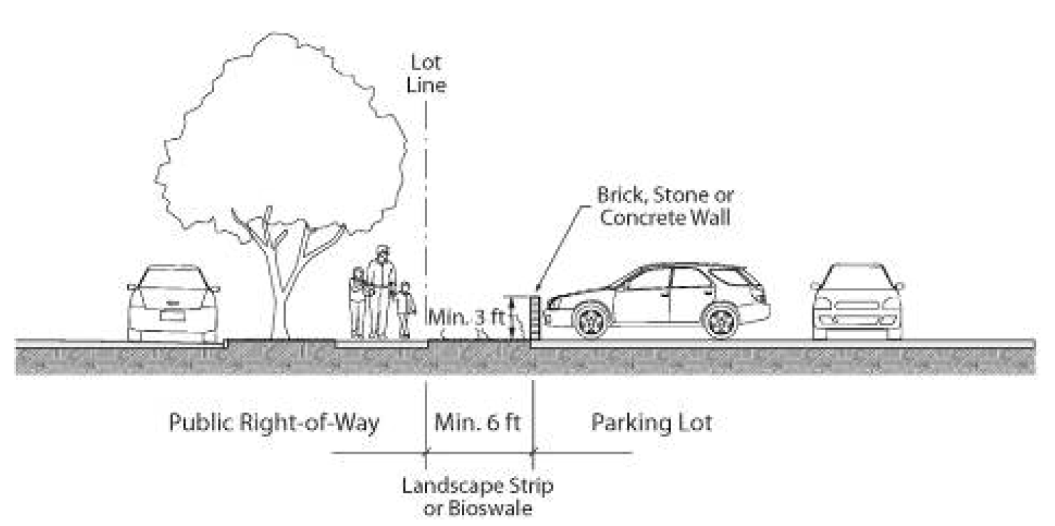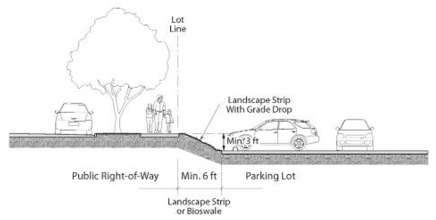Method C. The off-street parking and vehicle use area shall be setback a minimum six feet to accommodate a minimum three-foot drop in grade from the elevation at the right-of-way line to the elevation of the abutting off-street parking or vehicular use area (see Figure 806-3). The setback shall be landscaped according to the Type A standard set forth in SRC chapter 807.