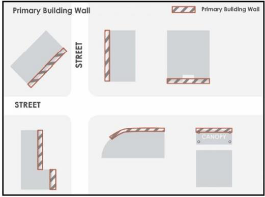Primary building wall means the length of a single building wall positioned to face a street frontage. For buildings located along two or more streets, the primary building wall is the longest streetfacing building façade. For curvilinear and varied building walls, the following illustration is provided as a guide for applying the definition: