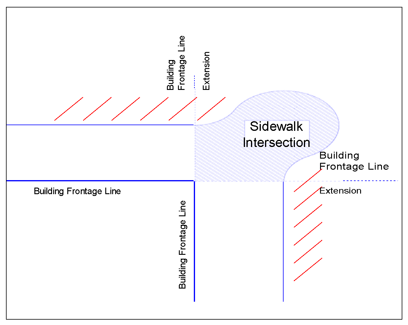Sidewalk intersection means the sidewalk area located adjacent to a street intersection created by extending a line from each building frontage to the edge of the curb at the intersection.