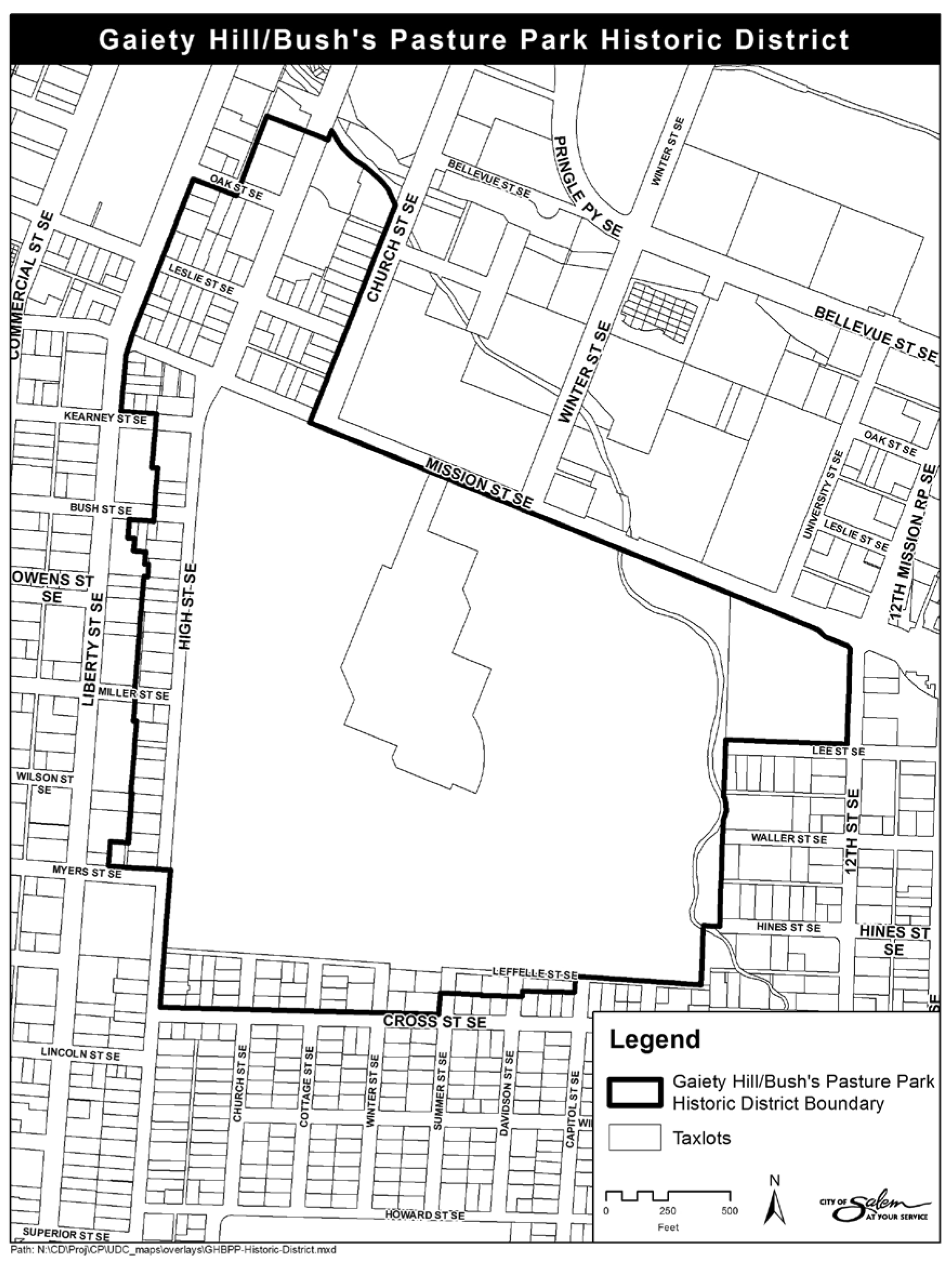 Gaiety Hill/Bush's Pasture Park Historic District (Figure 230-2). The Gaiety Hill/Bush's Pasture Historic District was listed on the National Register of Historic Places in 1986. The period of significance is 1878-1938. The area of the district is 143 acres, and includes 113 historic contributing resources and 32 non-contributing resources. Resources are primarily residential, and the most predominant style the Craftsman Bungalow. The district includes four major Lord and Schryver gardens. The district is most noted for Bush's Pasture Park, located at the center of the district.
