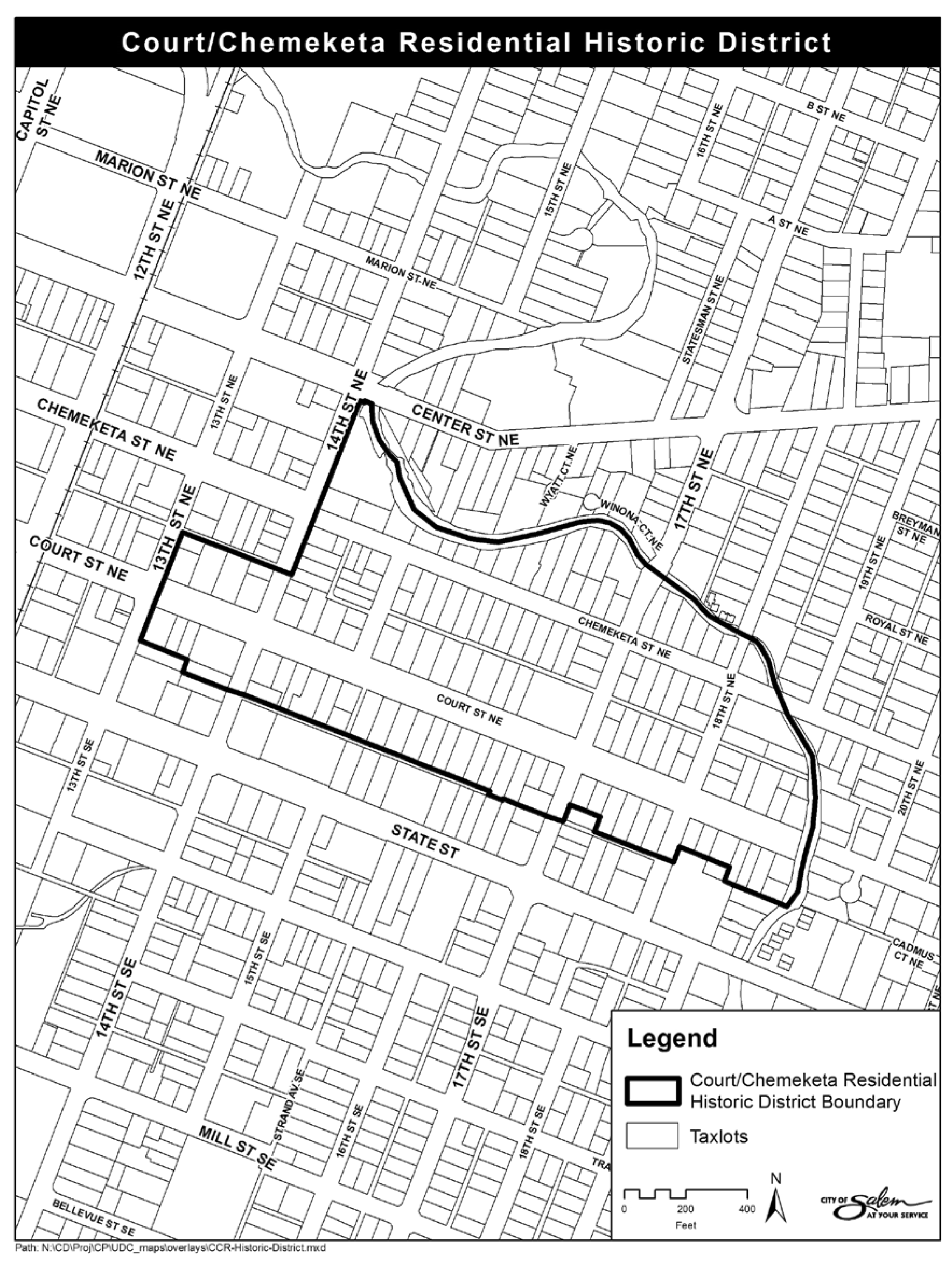 Court Street-Chemeketa Street Historic District (Figure 230-3). The Court Street-Chemeketa Historic District was listed on the National Register of Historic Places in 1987. The period of significance is 1860-1937. The area of the district is 38.75 acres and includes 99 historic contributing and 48 non-contributing resources. The overall character of the district is that of a late 19th and early 20th century neighborhood. Resources are primarily residential. The district is named for its two east-west streets. Court Street is a 99-foot wide boulevard lined with larger and older houses. Chemeketa Street is narrower and lined primarily with bungalows and cottages, some of which front Mill Creek.