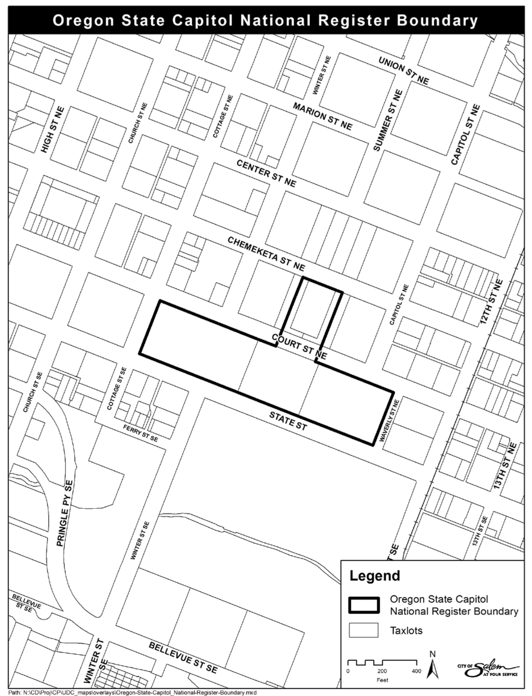Oregon State Capitol (Figure 230-5). The Oregon State Capitol was listed on the National Register of Historic Places in 1988. The Oregon State Capitol was constructed between 1936 and 1938, is 14.49 acres; includes the Capitol Building and adjacent wings, Wilson Park to the west, Capitol Park to the east, and extends to the north from the Capitol steps across Court Street to include one block of the former East and West Summer Streets and the sunken lawn terrace between these two streets.