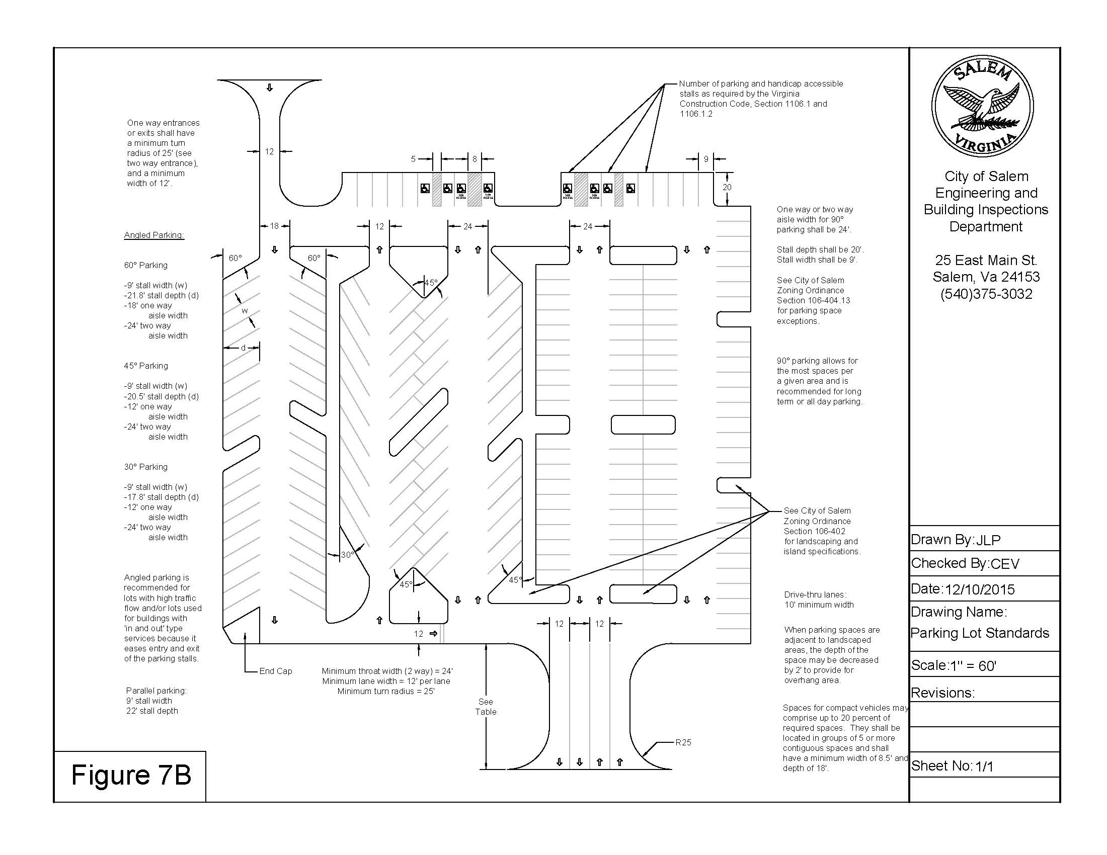 Off-street parking areas and parking spaces including handicapped spaces, loading spaces, and walkways indicating type of surfacing, size, angle of stalls, width of aisles, and a specific schedule showing the number of spaces provided and the number required by this chapter.