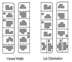 Varied Lot Widths. Making some lots wider and some narrower than the average can provide different amounts of open areas between structures. It also allows placement of different shapes and sizes of single-family dwelling units. On narrow lots, a variation of only three feet or four feet makes a perceptible difference.