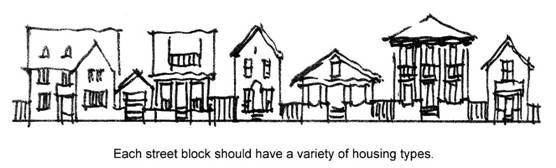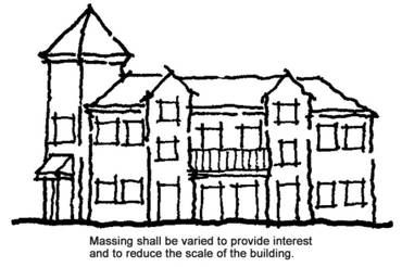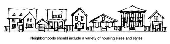 Housing should be "human scale" in massing, setbacks, and character. Residential developments should encourage structures that foster diversity in design and maintain the character of the community.