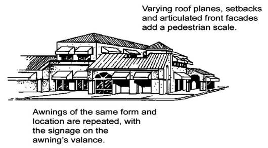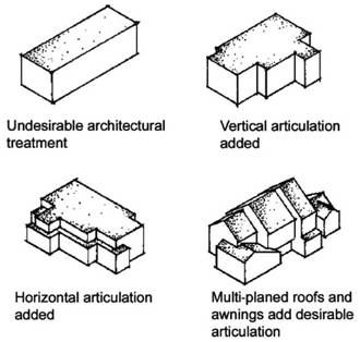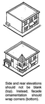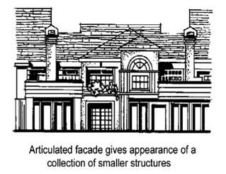 The articulation of facades and the massing of structures give them richness and scale. Long uninterrupted exterior walls in excess of thirty feet shall be generally avoided on all structures. Larger wall and roof planes shall include three-dimensional features such as porches, balconies, bay window, dormers, and similar features.