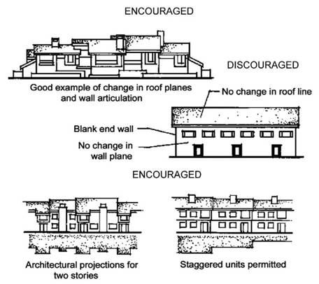 Varying the roof and building colors from dwelling unit to dwelling unit is encouraged.
