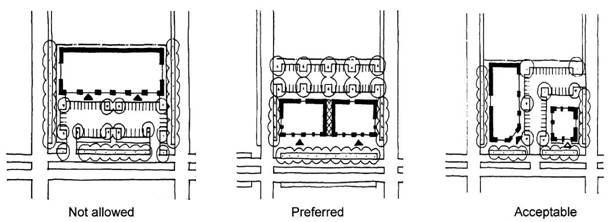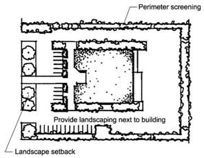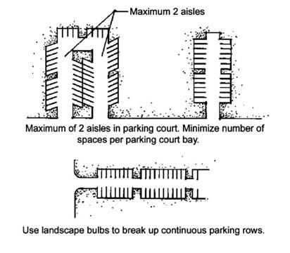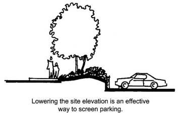 Parking lots for higher density multifamily housing shall not be allowed to dominate the frontage and must be located as unobtrusively as possible and be appropriately screened. In no case shall multifamily housing be allowed to back up to a street.