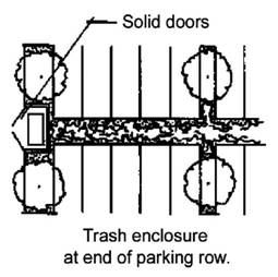 Recycling and Solid Waste Disposal. Throughout the village center, solid waste and recycling receptacles should be provided. Receptacles should have vertical metal bars and be painted to match other recommended features. To avoid overflow, receptacles should be sized to be at least a thirty-gallon capacity, especially in commercial areas, and should be properly anchored. Multiple coats of a powder coating or comparable finish are recommended for durability.