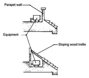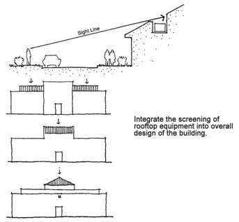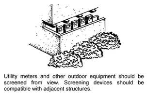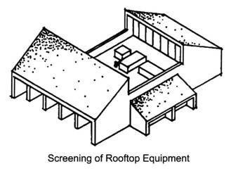 Screening. Any heating or cooling equipment or other mechanical equipment (excluding solar panels), whether on the roof, side of structure, or on the ground, shall be screened from view of public or private streets. The method of screening must be architecturally compatible in terms of materials, color, shape, and size. The screening design shall blend with the building design.