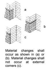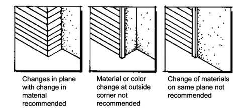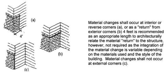 Exterior detailing, piecemeal embellishment, and frequent changes in materials shall be generally avoided. Materials tend to appear substantial and integral when material changes occur at changes in plane. Material or color changes at the outside corners of structures give an impression of thinness and artificiality that should be avoided. Material changes should not occur at external corners, but may occur at reverse or interior corners. Material changes not accompanied by changes in plane give materials an insubstantial or applied quality.