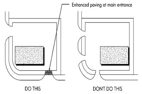 Paving. Special pavers are recommended in parks, plazas, and in crosswalks on main streets. Pavers should be durable and of brick, stone, or other materials appropriate to the traditional style of the region. Interlocking pavers should be used to avoid uneven edges. Paving patterns should be simple and should be reviewed to ensure quality and consistency.