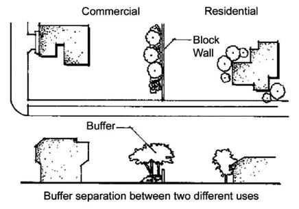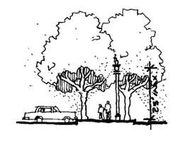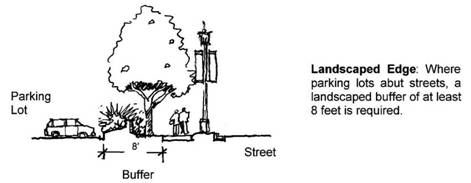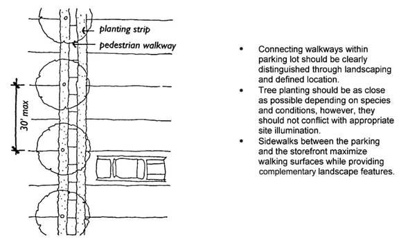 Plant Materials. Village center sidewalks are likely to be hardscaped, with generous tree grates around street trees. In residential districts, a common palette of groundscaping such as low plants is recommended for the area between paving and roadway. A judicious selection of plants includes consideration of site-specific conditions such as shade, wind, moisture, drought tolerance, and soils.