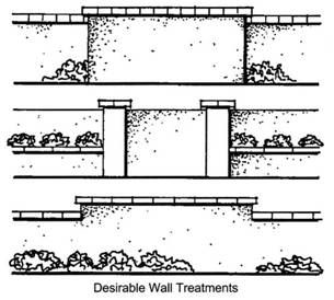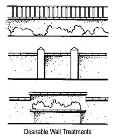 The use of sound walls shall be minimized except when required as an environmental mitigation measure. Sound walls shall be of masonry, concrete, smooth stucco finish, or other approved material; however, decorative elements (such as tile insets, etc.) may also be incorporated into sound walls to improve their appearance. The style, material, and color of sound walls shall complement neighborhood architecture. All sides of sound walls visible from public or private streets shall be architecturally treated.