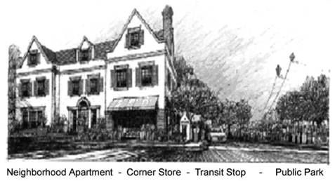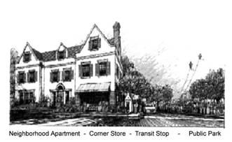The average residential densities per net acre should be highest at the village center and should generally decrease through the adjoining neighborhoods and become predominately low density uses at the neighborhood edges. Neighborhoods should be organized to allow the majority of the residents to walk to either a neighborhood center or the village center main street within five to ten minutes.