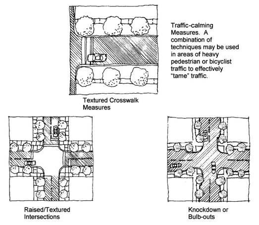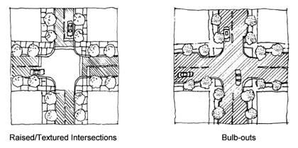 Bulb-outs, Textured Crosswalks, and Raised Intersections. These features can be used singly or in combination. Bulb-outs slow traffic and reduce pedestrian crossing distances by narrowing the curb-to-curb dimension of the street, either at an intersection or mid-block. Bulb-outs are typically created by eliminating the parking area next to the intersection when a turn lane is not needed. Crosswalks can be textured by means of special pavers or other treatment, to alert drivers that the area being traversed has a special identity for pedestrians. Raised intersections raise the entire intersection a few inches to make drivers aware of pedestrian crossings.