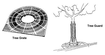 Tree Guards. Tree guards should extend vertically from tree grates to protect trees in highly active areas. To relate to other site furnishings, tree guard bars should be narrow and vertical, and should be attached to the tree grate. Welds should not be visible. Tree guards should be about four feet in height with openings varying in diameter according to tree species.