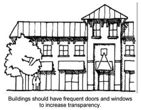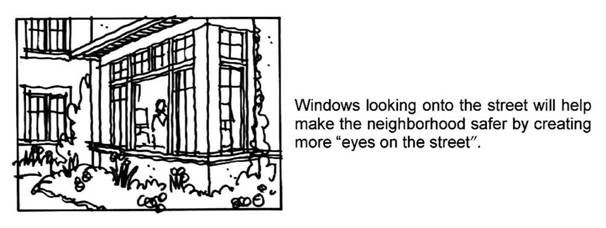 Provide at least one window that looks out onto the life of the street from an active room. These "eyes on the street" should make each neighborhood a safer place and provide connection to the street to encourage neighborhood interaction.