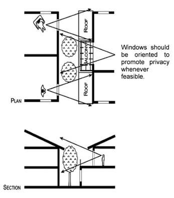 Natural Surveillance. Whenever feasible, design and placement of residential dwellings and other physical features are encouraged to maximize visibility and facilitate natural surveillance from public rights-of-way and other public areas. This includes building orientation, placement of windows, doors, and balconies, building and site entrances and exits, placement and type of landscape materials, types of walls and fences (including the use of picket, wrought-iron, and similar materials to promote visibility when appropriate), and other physical obstructions in a manner that discourages the potential for criminal activity.