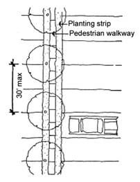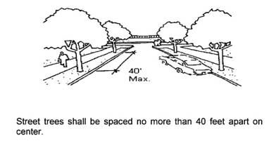 Spacing. Street trees should be planted on both sides of streets and generally be spaced no more than forty feet apart.