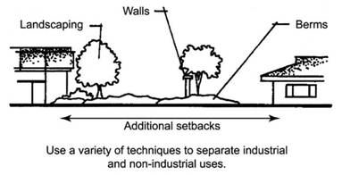 Where a natural open space corridor or a pedestrian-friendly boulevard borders a neighborhood edge, the dwelling units along the neighborhood edge should face onto these spaces or boulevards. If the neighborhood is adjacent to agricultural operations, a variety of buffering techniques should be used such as tree rows, streets, etc.