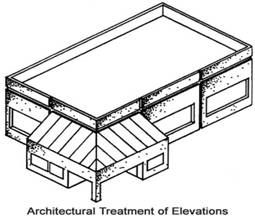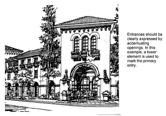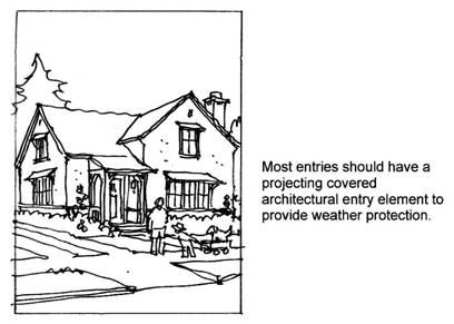 Entries. A projecting architectural entry feature such as a shed, arch, or gable providing roof coverage and weather protection should accompany entries. Entries should be an integral architectural feature compatible with the main structure.