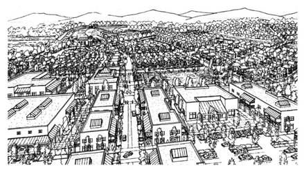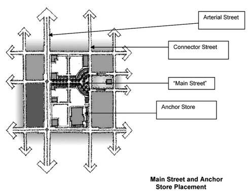 Main Streets. Each village center shall also have a main street of shops. The main street should have two lanes with one lane in each direction with parking on both sides. In addition, areas of intense development within the villages may have commercial streets that have added dimension for more frequent truck delivery and emergency access to taller buildings.