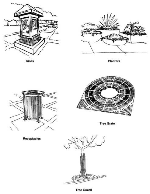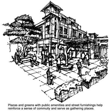 Street Paving and Furnishings. Paving, plants, and site furnishings should help set the character of the village and neighborhood centers. These features should be consistent with the following recommendations, whether in streets, parks, plazas, or as on-site landscaping: