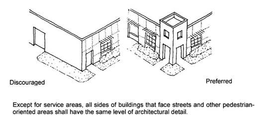 The entire structure shall have a coherent architectural style with the transition from the front, sides, and rear elevations being gradual not abrupt. Architectural style and details shall be consistent on all facades that are visible from adjacent streets or alleys.