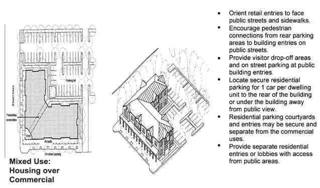 Dwelling units are to be oriented to the local street system and public spaces with entries, balconies, porches, and architectural features to enliven the streets, provide "eyes on the street," and create safe and pleasant walking environments.