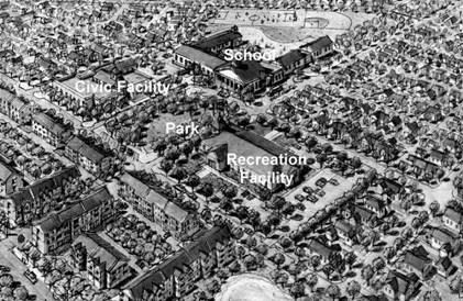 Small parks should be distributed throughout the neighborhood and elementary schools should be easily accessible within a five- to ten-minute walking distance to a majority of the residents.