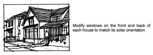 Consider the dwelling unit's solar orientation for window placement. Tailoring window placement to the dwelling unit's location creates alternating elevations that vary for practical, ecologically sound reasons.