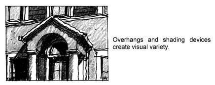 Visual variety can be achieved with roof forms, overhangs, and shading devices that relate to the solar orientation of a lot. This results in a more livable and energy efficient dwelling unit and brings a subtle and natural variety to a neighborhood's streetscape.