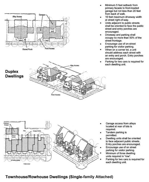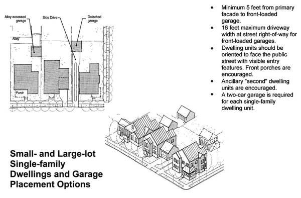 Site Planning. It is the intent of these standards to discourage developments where identical single-family dwelling units march down long, uninterrupted streets, with no variation in building scale, placement, or the street scene, and which create no sense of place. Rather, these standards are intended to encourage single-family dwelling units with attached porches and with garages placed back from the street or accessed from rear alleys to promote visual interest, neighborhood interaction, and facilitate natural surveillance by residents and pedestrians.